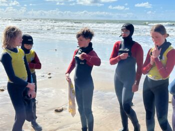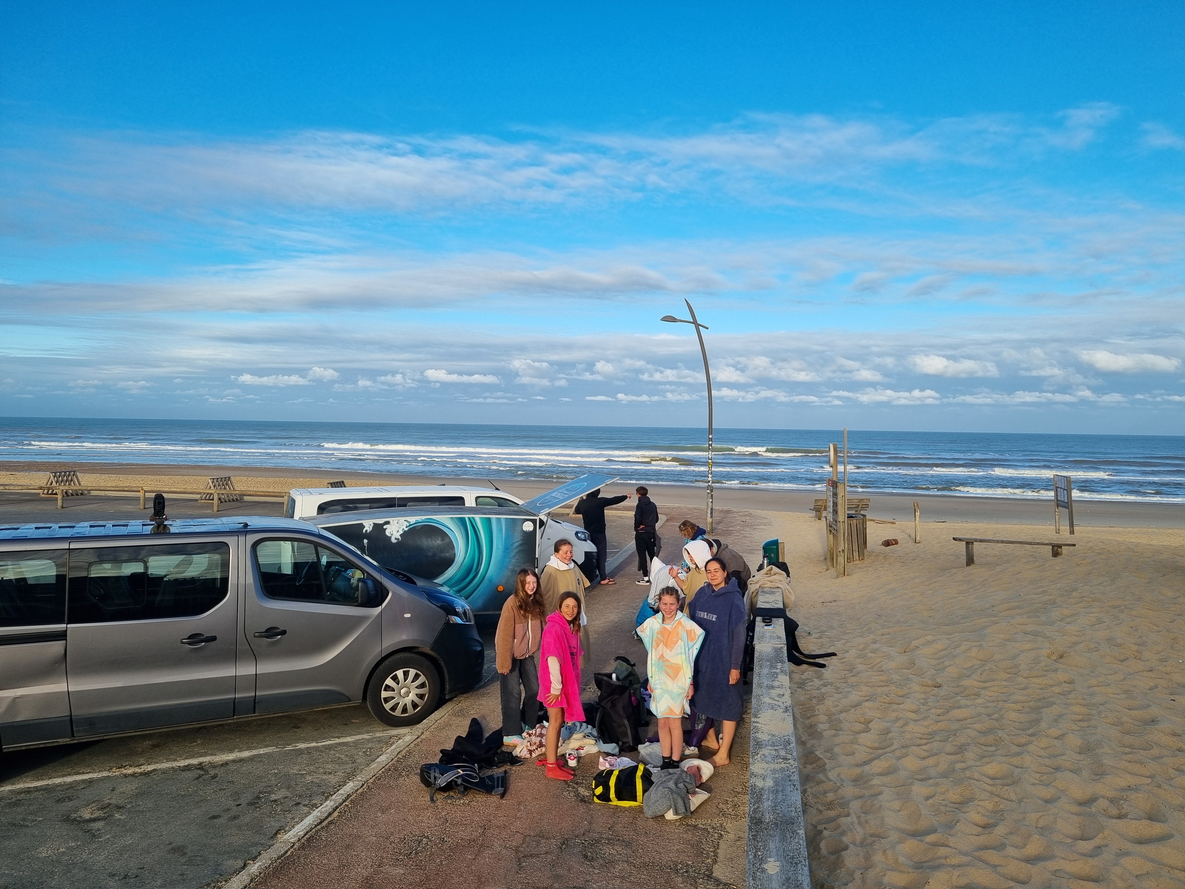 Le mercredi a commencé de bonne heure à 7 h, avec un réveil difficile mais en musique pour les filles (Vamos a la playa). Après le petit déjeuner, nous sommes d’abord allés surfer à Montalivet. Une session intense où tout le monde a passé la barre. Gaby, qui avait un petit peu mal au ventre avant la session, nous a fait une belle « galette » dans une vague (le pauvre), mais il allait mieux après ! Nous avons tous bien ramé et bien subi les vagues puissantes du bord et de la baïne.