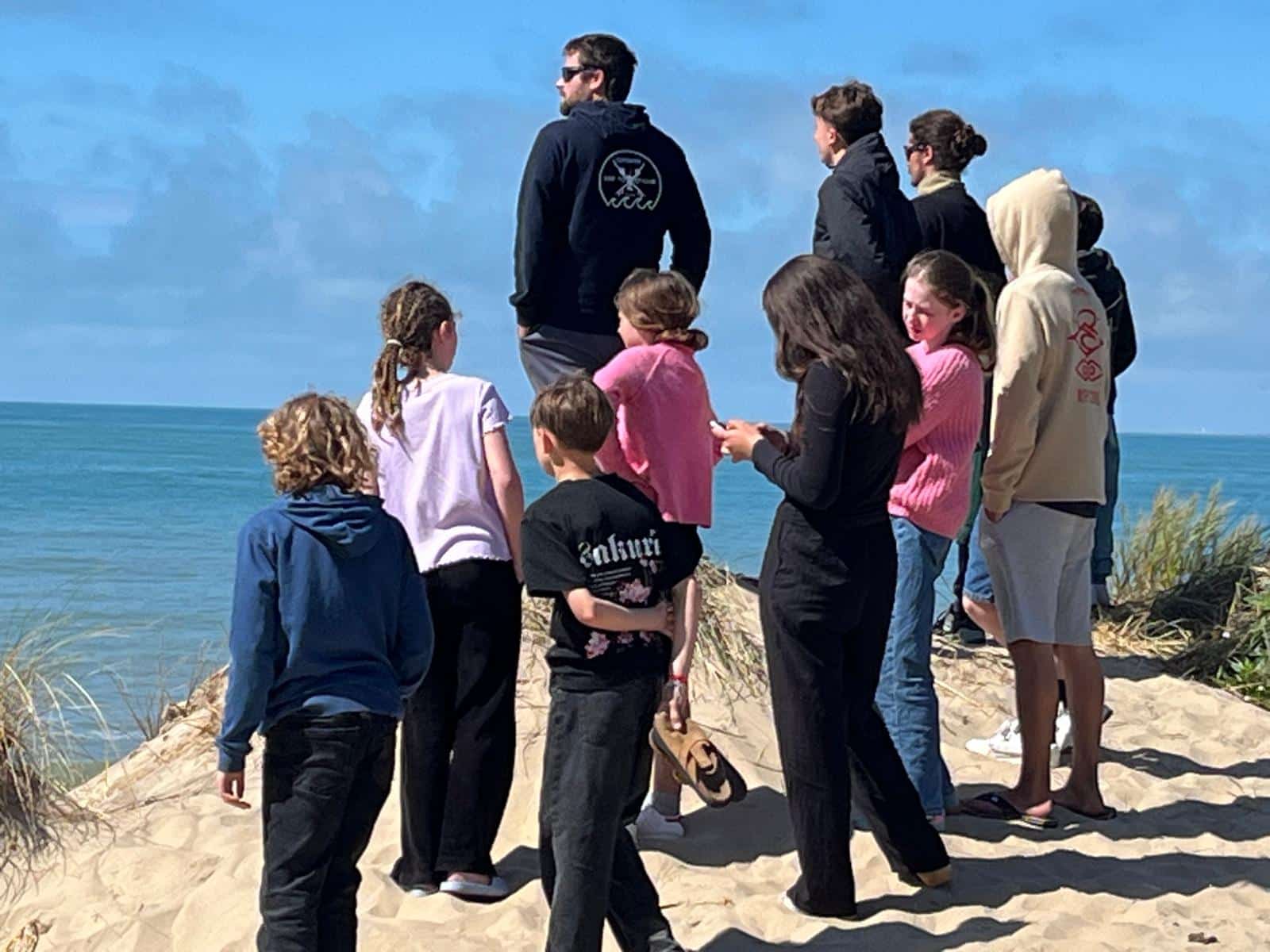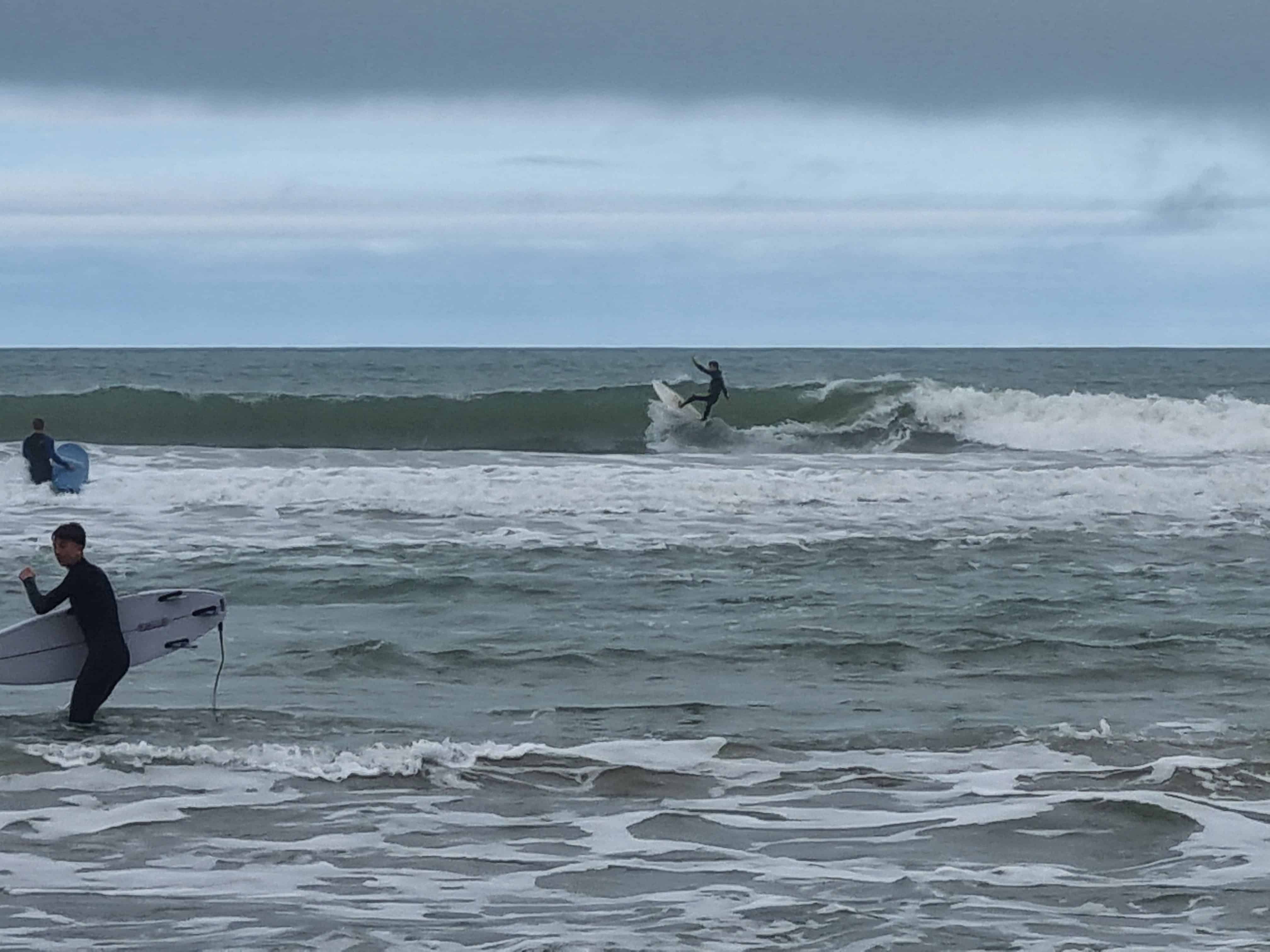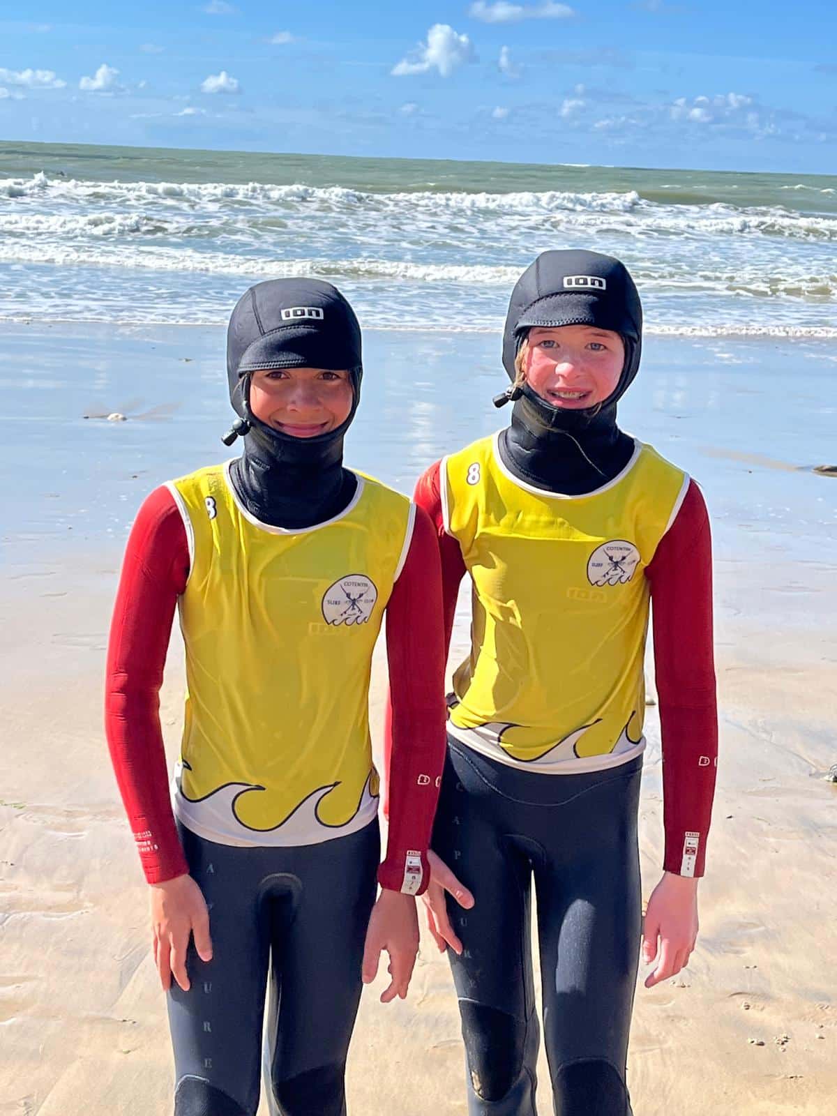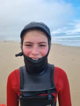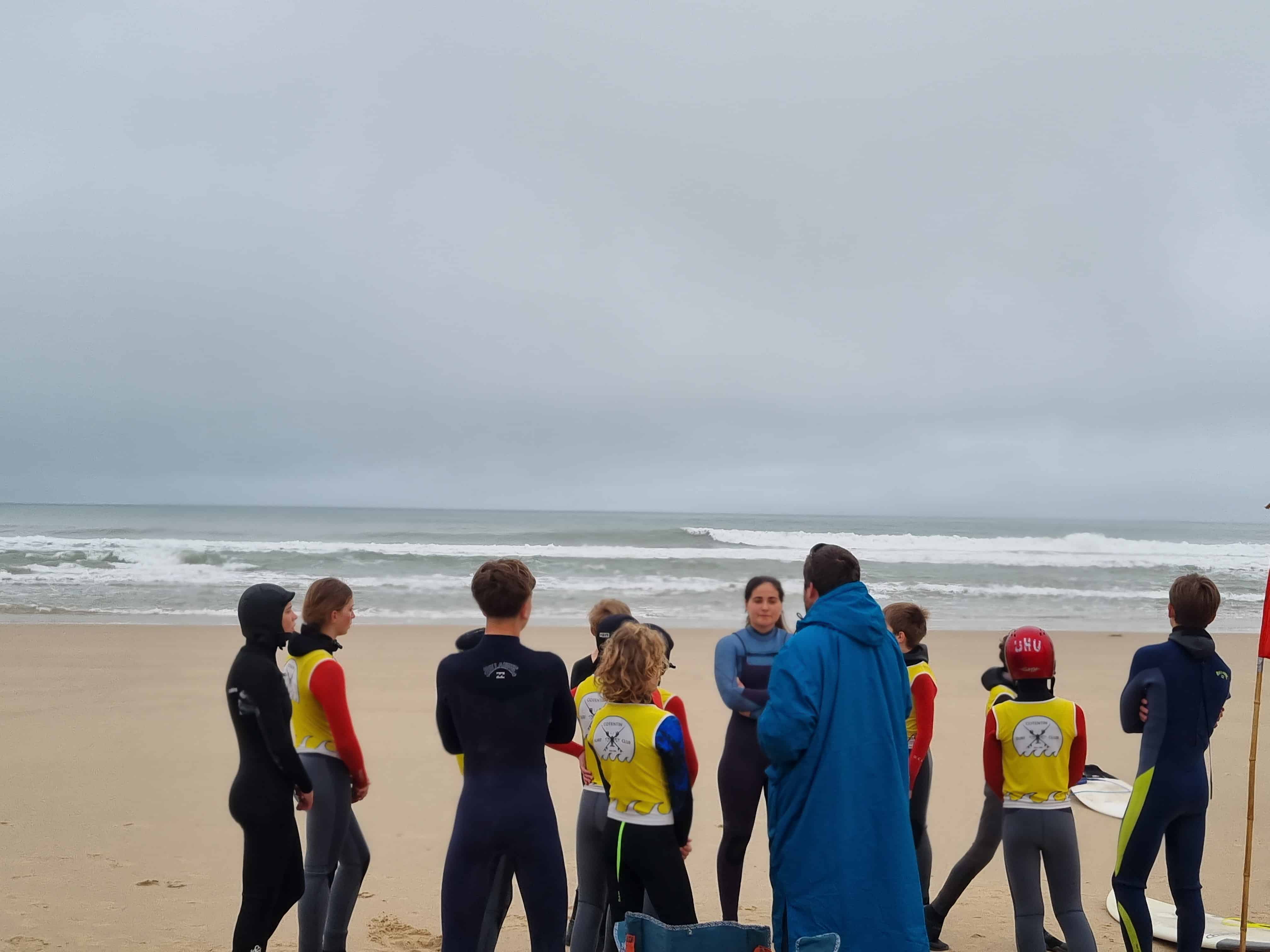 Après le repas, un groupe est parti au pump track tandis qu’un autre a joué au ballon en attendant la bonne marée pour faire une deuxième session. Nous sommes partis du camping vers 15 h 30 pour aller au spot de l’Amélie. Tout le monde a passé la barre, mais les vagues étaient ventées (il y avait pas mal de clapot). Tout le monde a bien profité et a pris plein de vagues !