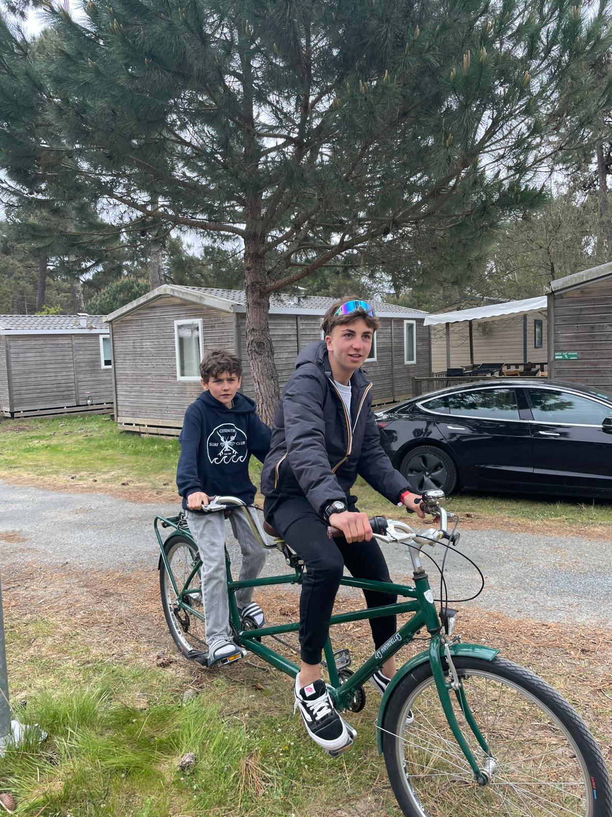Céline et Seb ont loué un tandem pour se déplacer dans la matinée pendant que nous surfions. Nous leur avons évidemment emprunté pour faire des tours dans le camping ! Baptiste et Elise ont joué les chauffeurs en pilotant le vélo. C’était très drôle, même si la coordination reste à revoir !