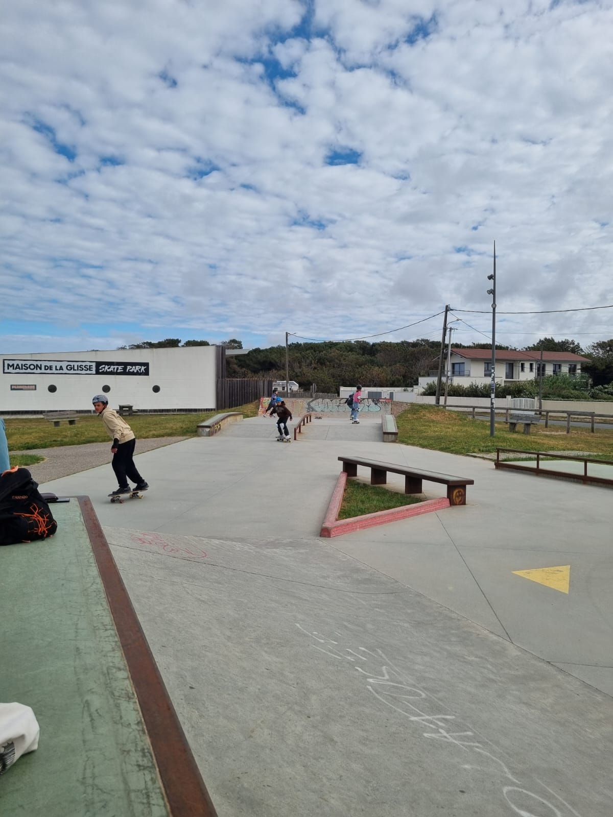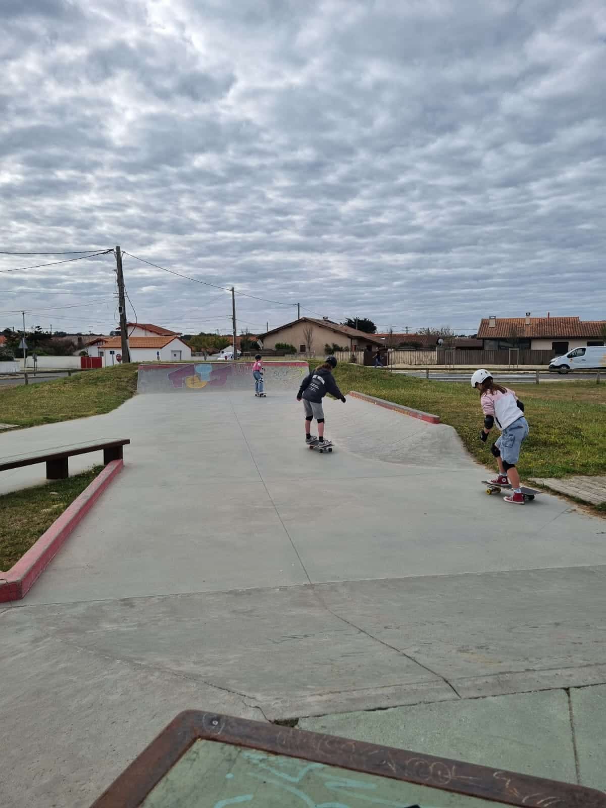 Vers 10h30, nous sommes allés voir les vagues à plusieurs spots différents, mais les coachs ont dit que ça allait être difficile et gros. Donc nous sommes allés faire du skate au skatepark de Montalivet. Gabi a lâché une bonne performance dans le bol. Lucia et Alix ont réussi à descendre une rampe et ont même droppé toutes seules !!! On a eu de belles chutes mais rien de grave.
