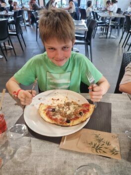 Après ce bon repas, comme il faisait beau, nous sommes allés à la piscine avec Élise, Sara, Lucia, Léonie, Alix, Sandro, Axel, Gabi et Xavier. Nous avons fait le gros toboggan avec beaucoup de sensations (Alix a crié de toutes ses forces). Pendant ce temps, Enzo, Martin, Hugo et Baptiste étaient au pumptrack.