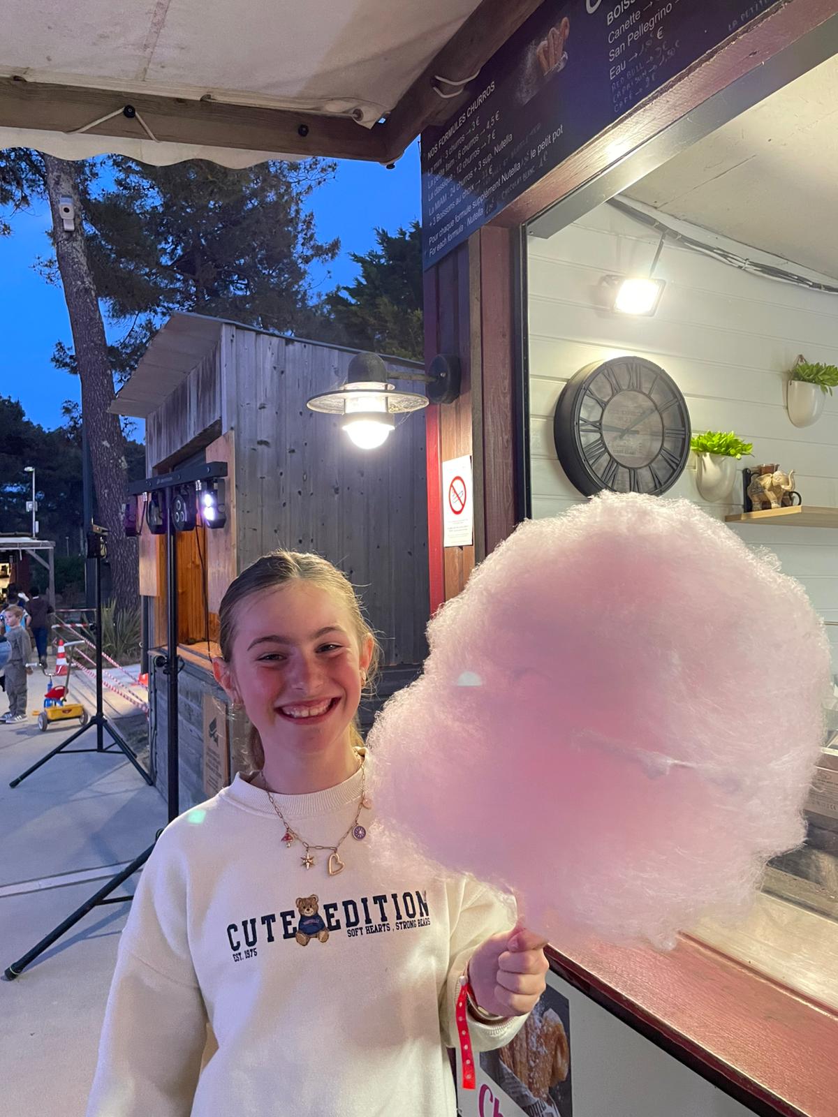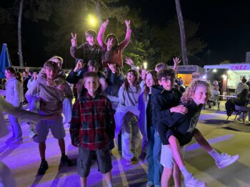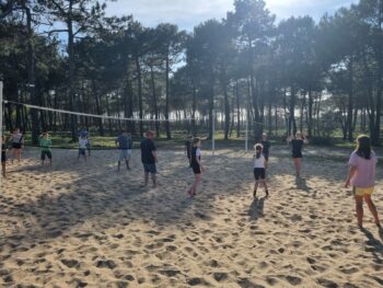 Après, on a fait un beach-volley, c’était trop bien. Puis nous nous sommes douchés et préparés pour aller au restaurant. C’était pizzas ! Quand tout le monde fut calé, on a mangé des churros (chichis) et de la barbe à papa du camping lors de la soirée dansante. Et on a dansé la danse du camping.