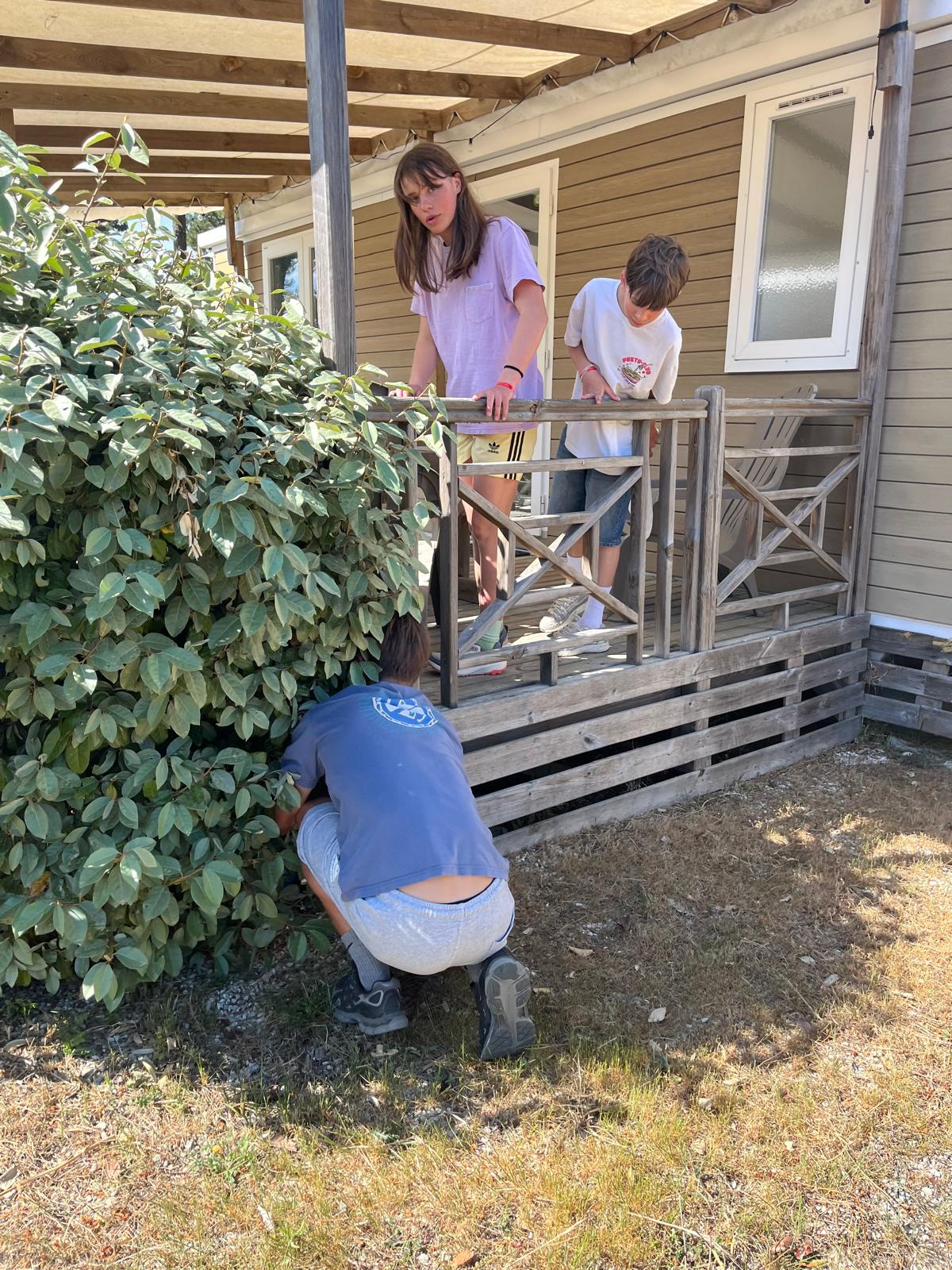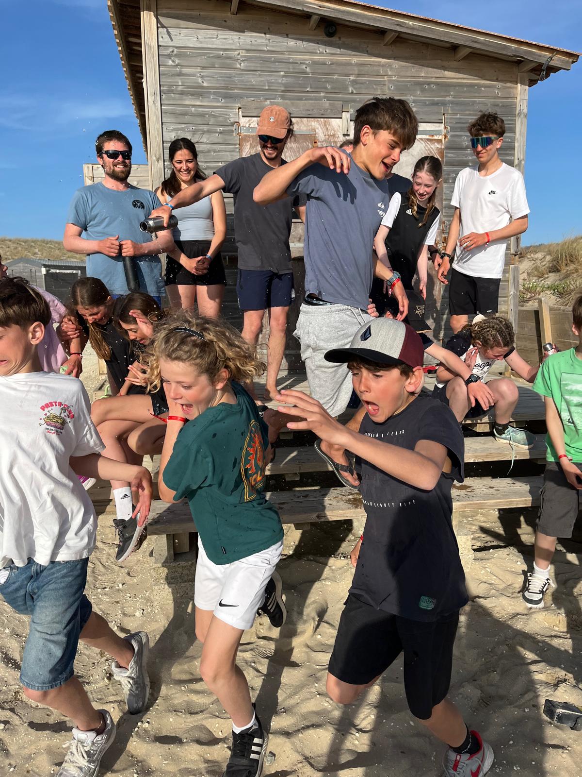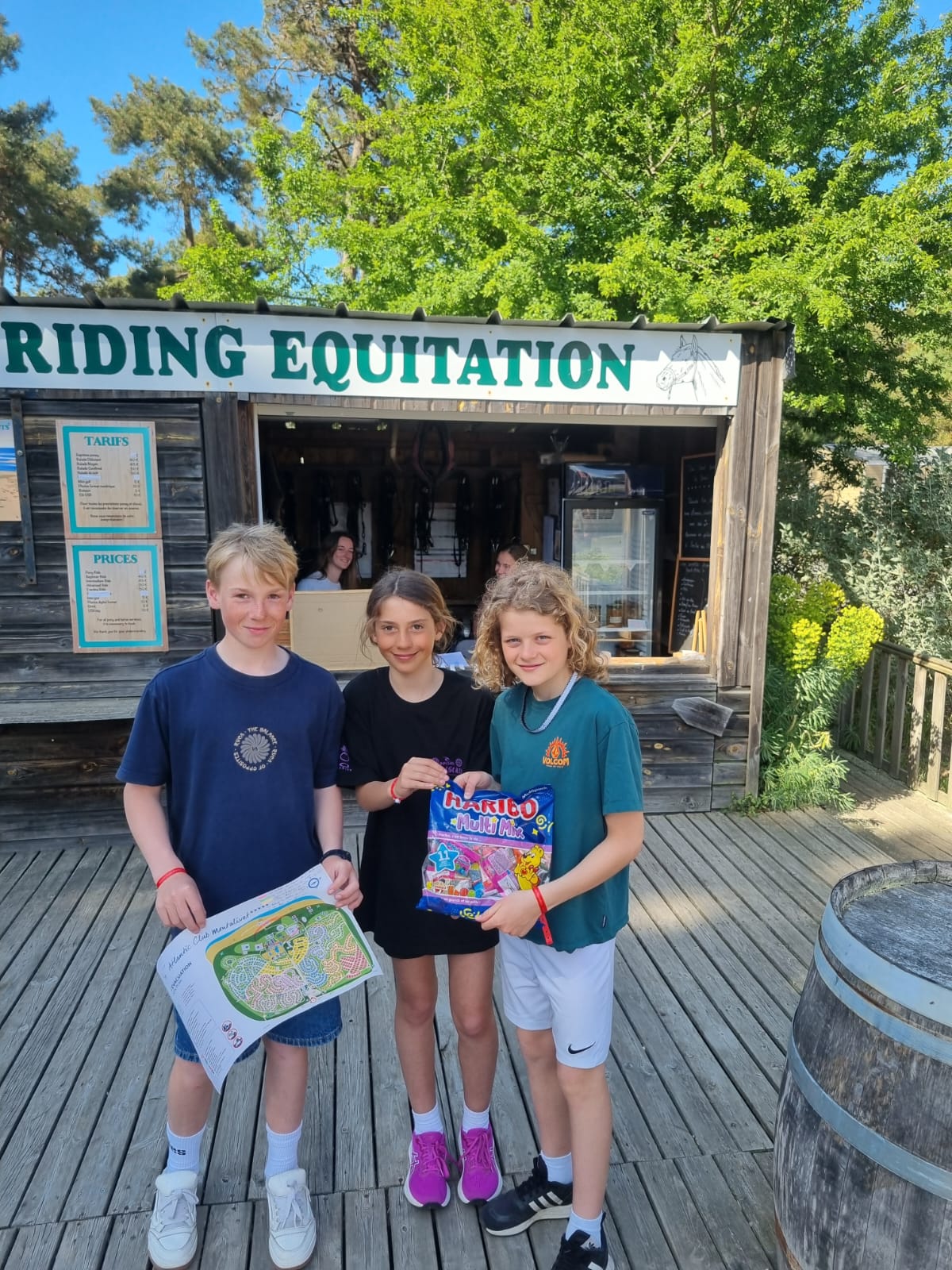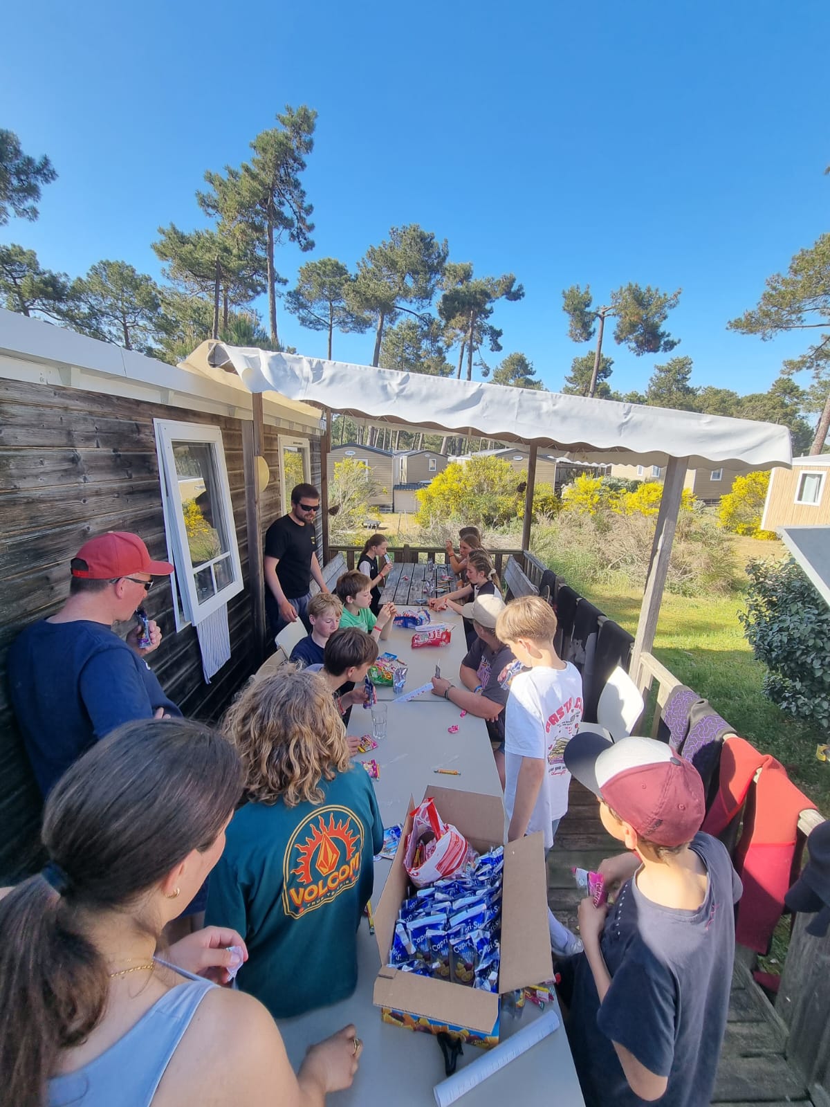 Pendant ce temps, les adultes nous préparaient une surprise et nous ont dit de rentrer vers 16h. Une fois de retour, ils nous ont annoncé la surprise : une grande chasse au trésor par équipe dans le camping, avec des énigmes pour trouver de la nourriture. L’équipe de Martin, Sandro et Sara a trouvé le plus de bonbons. Le groupe de Xavier avec Élise, Alix, Axel et moi a trouvé un paquet de bonbons vers la plage. Le groupe de Sébastien en a trouvé un vers le terrain de tennis. Le groupe de Tom en a trouvé un au centre équestre, où il fallait dire l’ancien nom du club de surf (les crevettes surf club). Et pour terminer, le groupe de Céline a trouvé un pack de Capri-Sun dans la haie d’un mobil-home et un paquet de bonbons dans une machine à laver. Ensuite, nous avons partagé nos trouvailles et on a goûté.