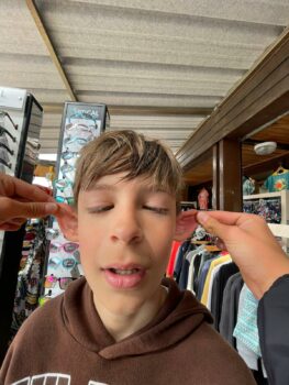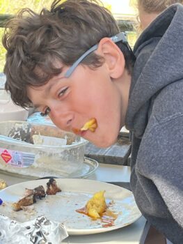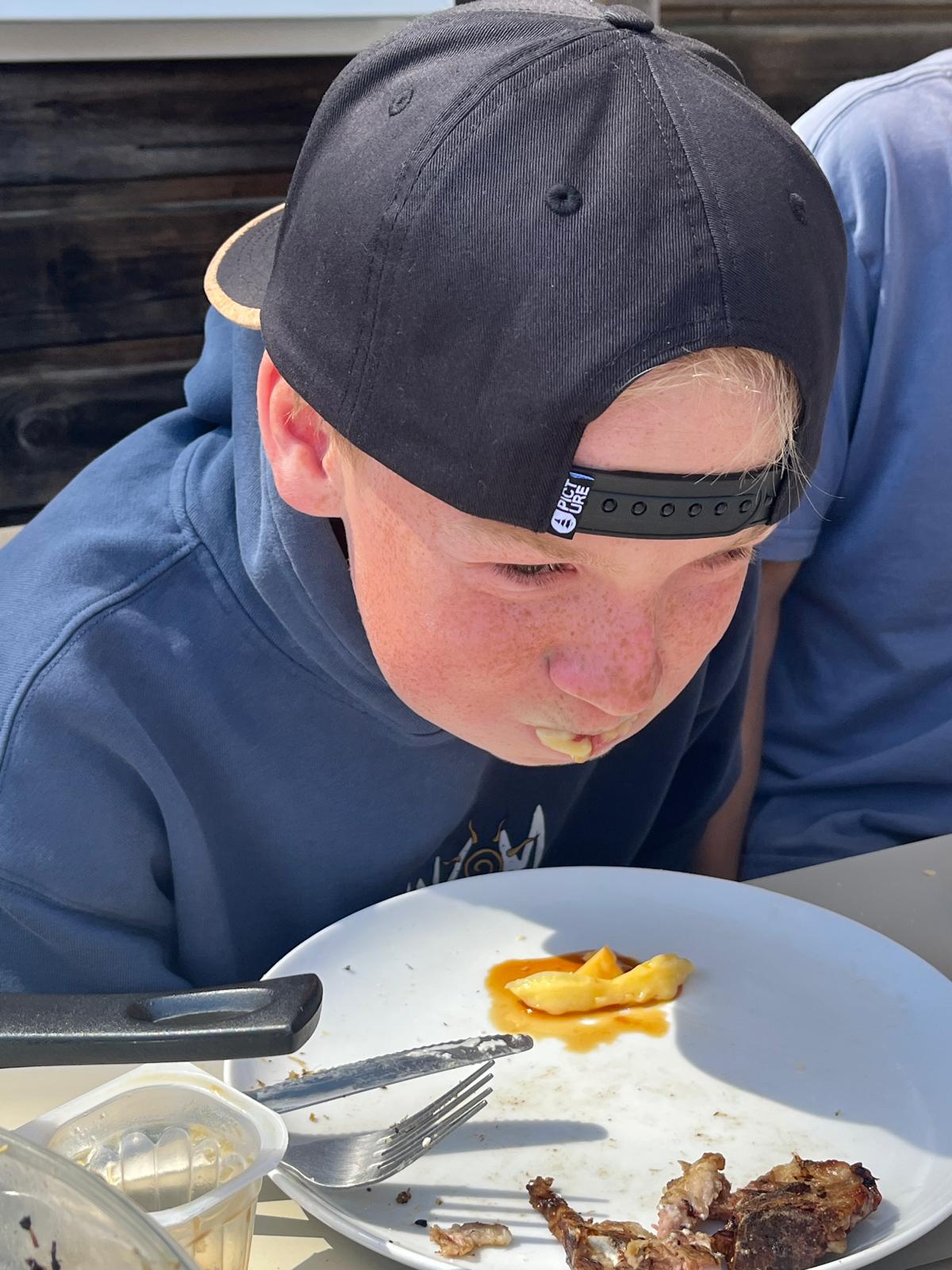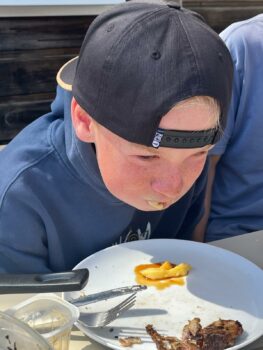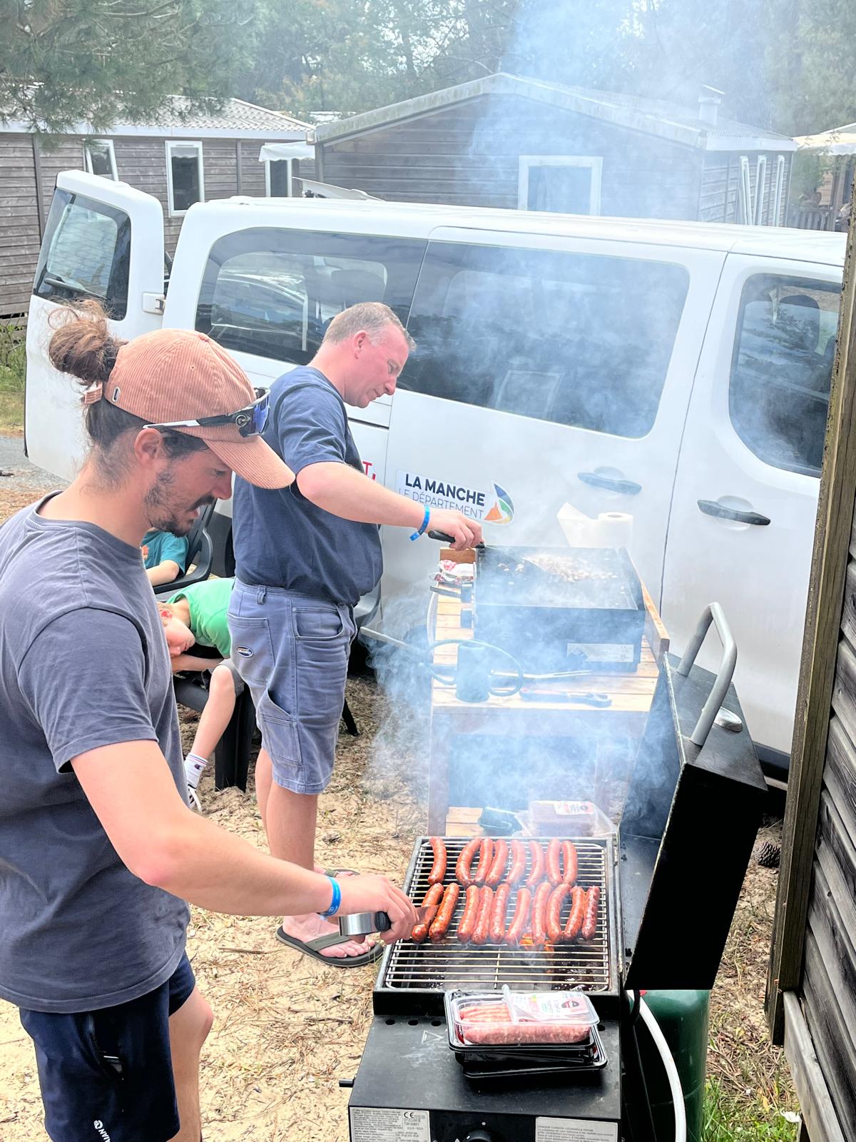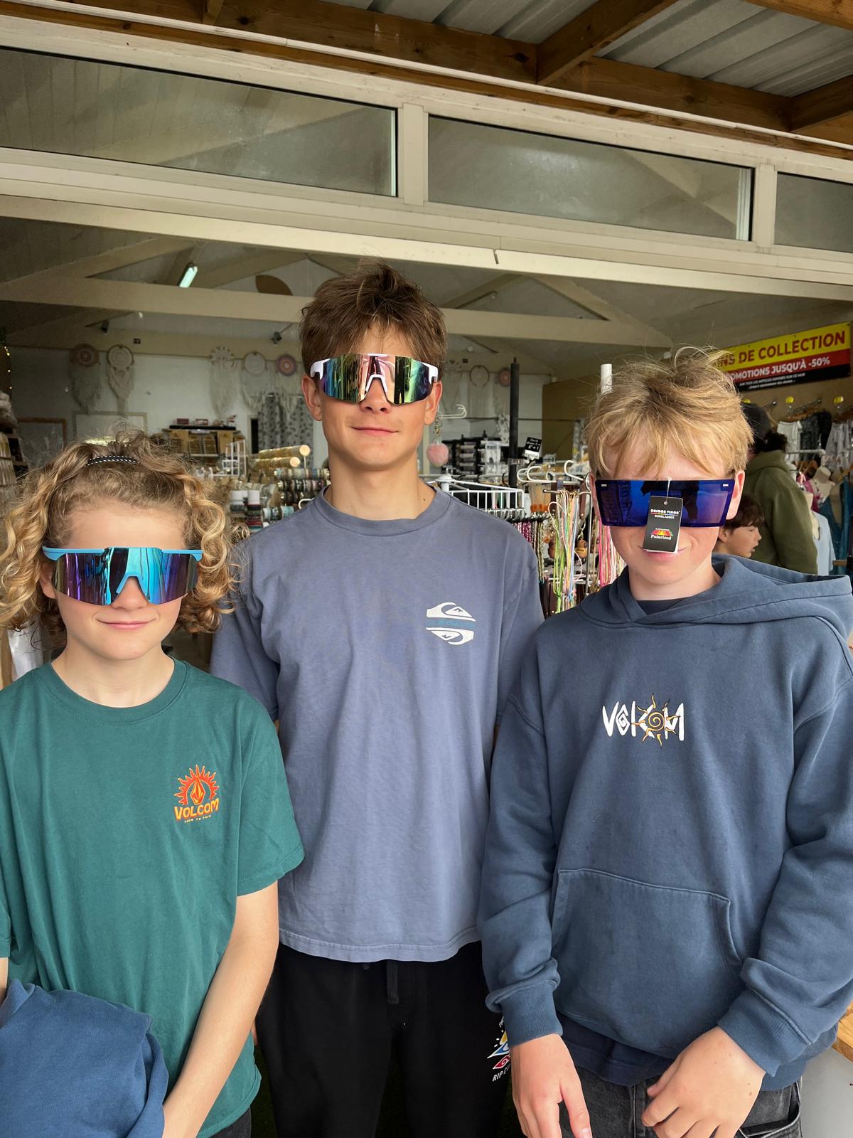 Puis nous sommes allés faire les magasins, on a acheté de beaux souvenirs de Montalivet et on a essayé des lunettes bizarres. C’était bien. Le midi, c’était barbecue : saucisses, merguez, côtes de porc, chipolatas et des patates à la plancha avec une sauce à la crème faite par Martin et Gabi, sans oublier le bout de camembert. En dessert, c’était concours de Flanby, et c’est Tom le plus fort.